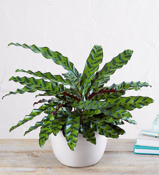 • Calathea Rattlesnake has a bushy, spikelike appearance with variegated markings and burgundy undersides