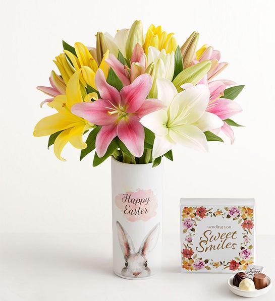 Lilies and bunnies are the ultimate Easter duo. Here we artfully arrange pink, yellow, and white star-shape blooms in a whimsical vase decorated with a friendly rabbit and the sentiment “Happy Easter.” Not only will the lucky recipients relish the fragrant bouquet now, but they’ll also enjoy the vase for many Easters to comes.