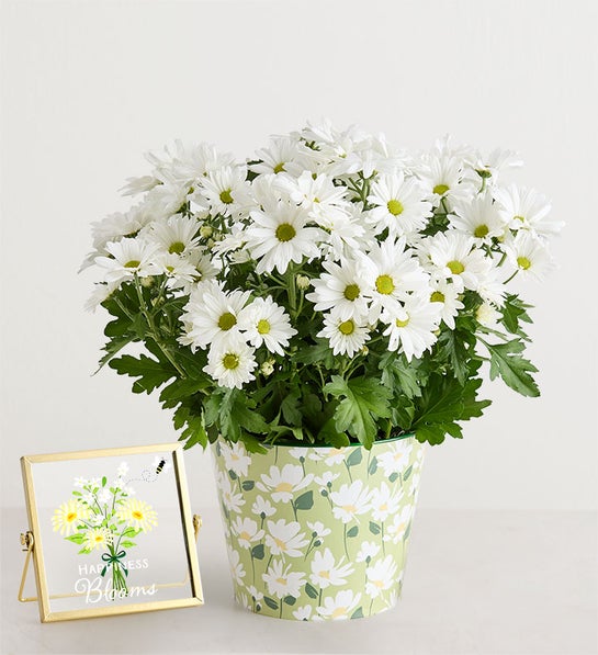 Daisies are almost guaranteed to brighten their day. That’s why our blooming white daisy mum plant arrives in a daisy-adorned planter: It’s a double dose of happiness. For even more cheer, add our “Happiness Blooms” plaque to their gift.