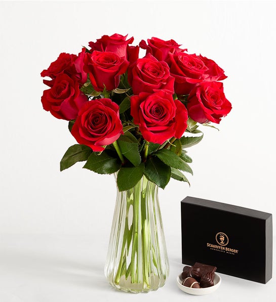 NEW Red roses, sumptuous chocolates: Together, they’re a classic way to show your Valentine how much you love them. Our pairing of a dozen carefully selected farm-fresh roses with a box of sumptuous Scharffen Berger® chocolates is a luxurious version of the time-honored declaration of love.